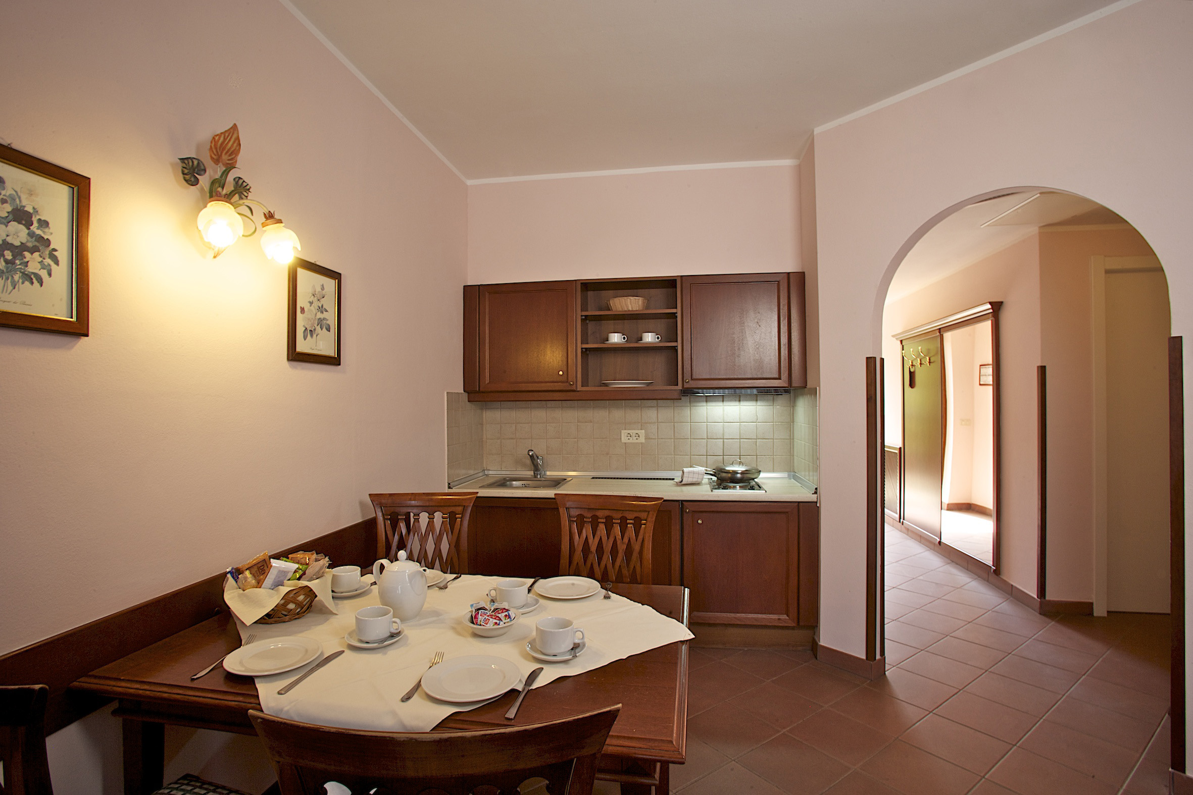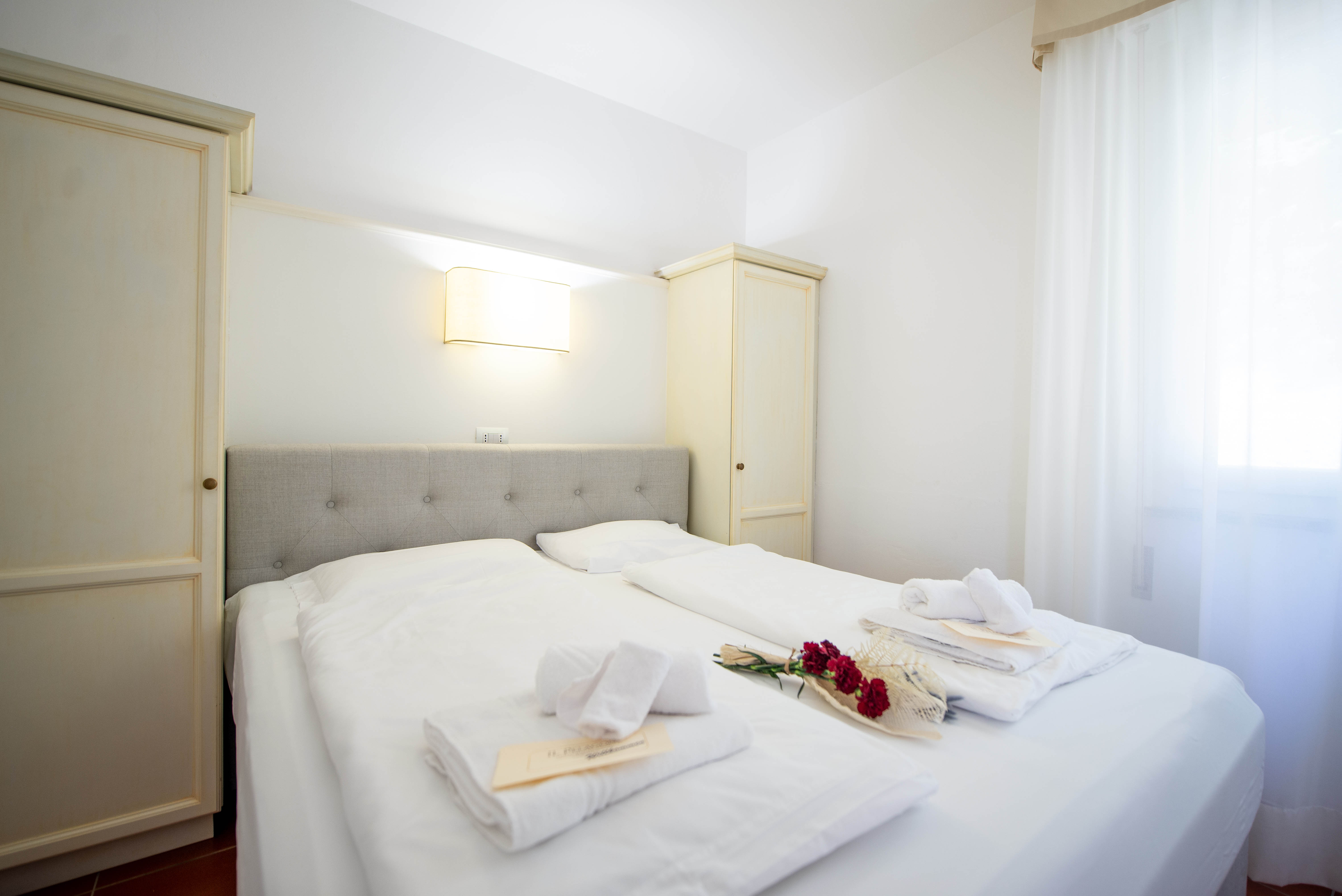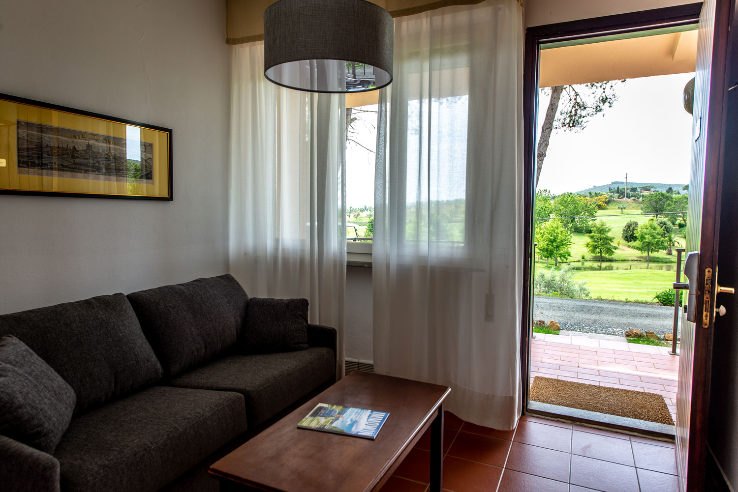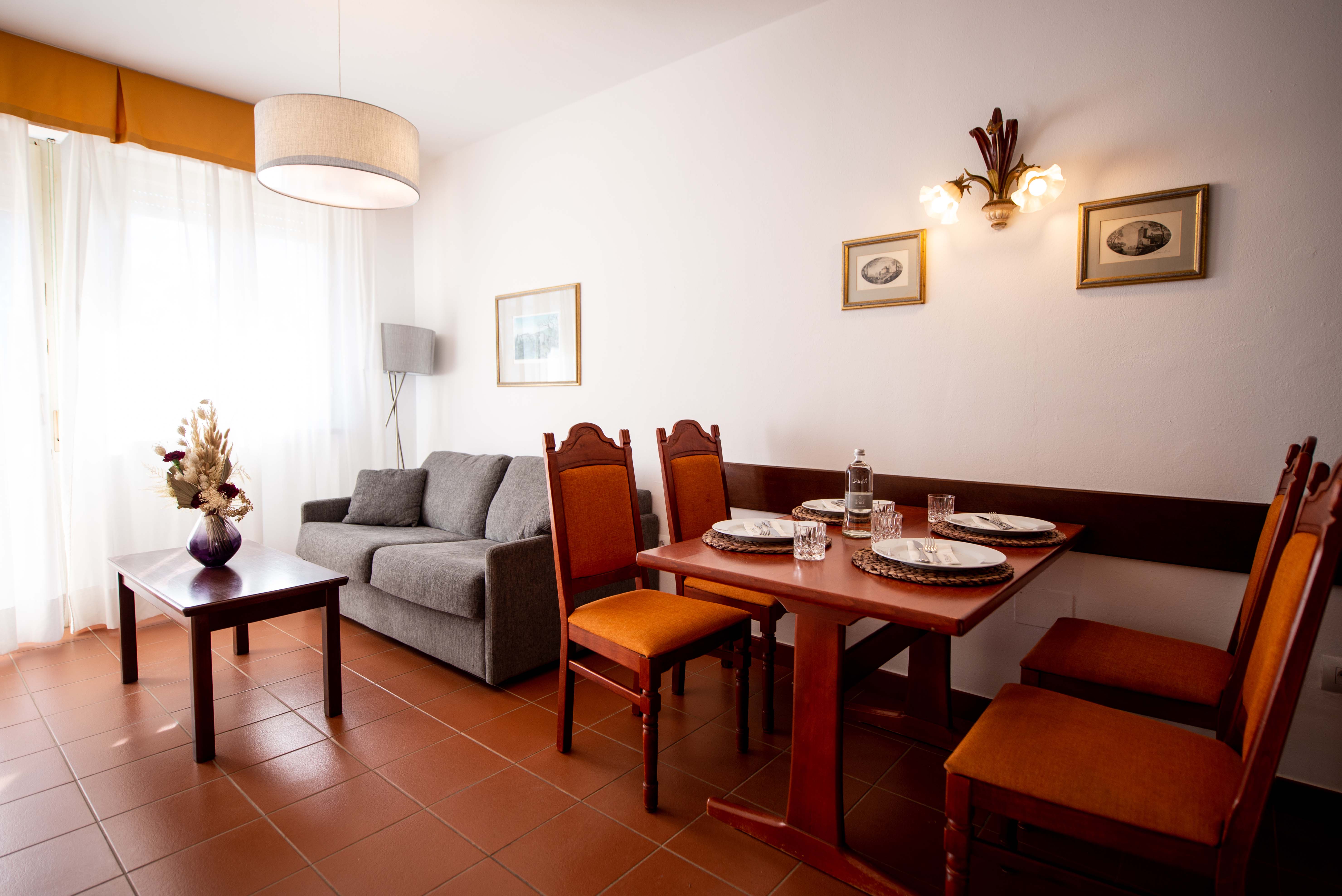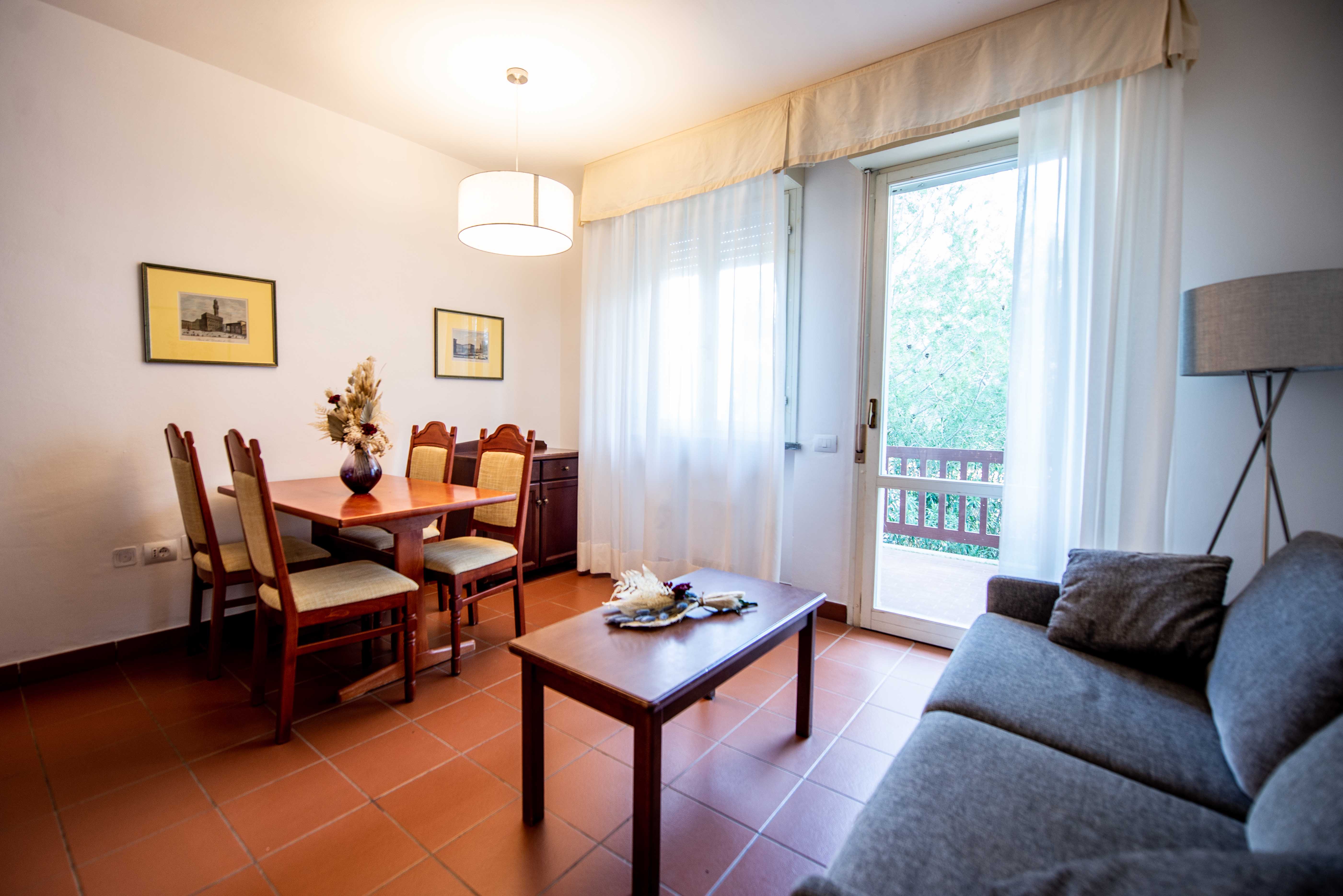 60 m² / max. 6 people / 2 double beds + 2 extra beds A 60 m² family apartment that evokes the warm atmosphere of typical Tuscan residences. It consists of 2 bedrooms with double beds, a large living room with a sofa bed, a main bathroom with shower and bidet, a second