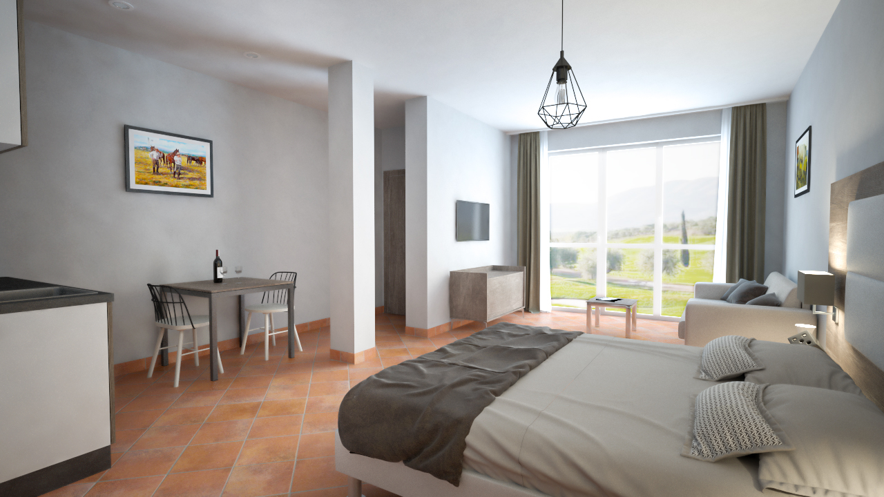 35-38 m2 / 1-2 / Double bed Recently renovated apartment in typical Tuscan style, where a guest or couple can relax in a cozy environment. A private space of 35 or 38 square meters, featuring a double bed, sofa, bathroom with shower and bidet, terrace (ground floor) or balcony (first floor), air conditioning, small refrigerator, telephone, satellite channels, flat-screen TV, heating, and hairdryer. The apartment has a corner for making coffee or a small breakfast, or for enjoying lunch or dinner from our restaurant with takeaway service.