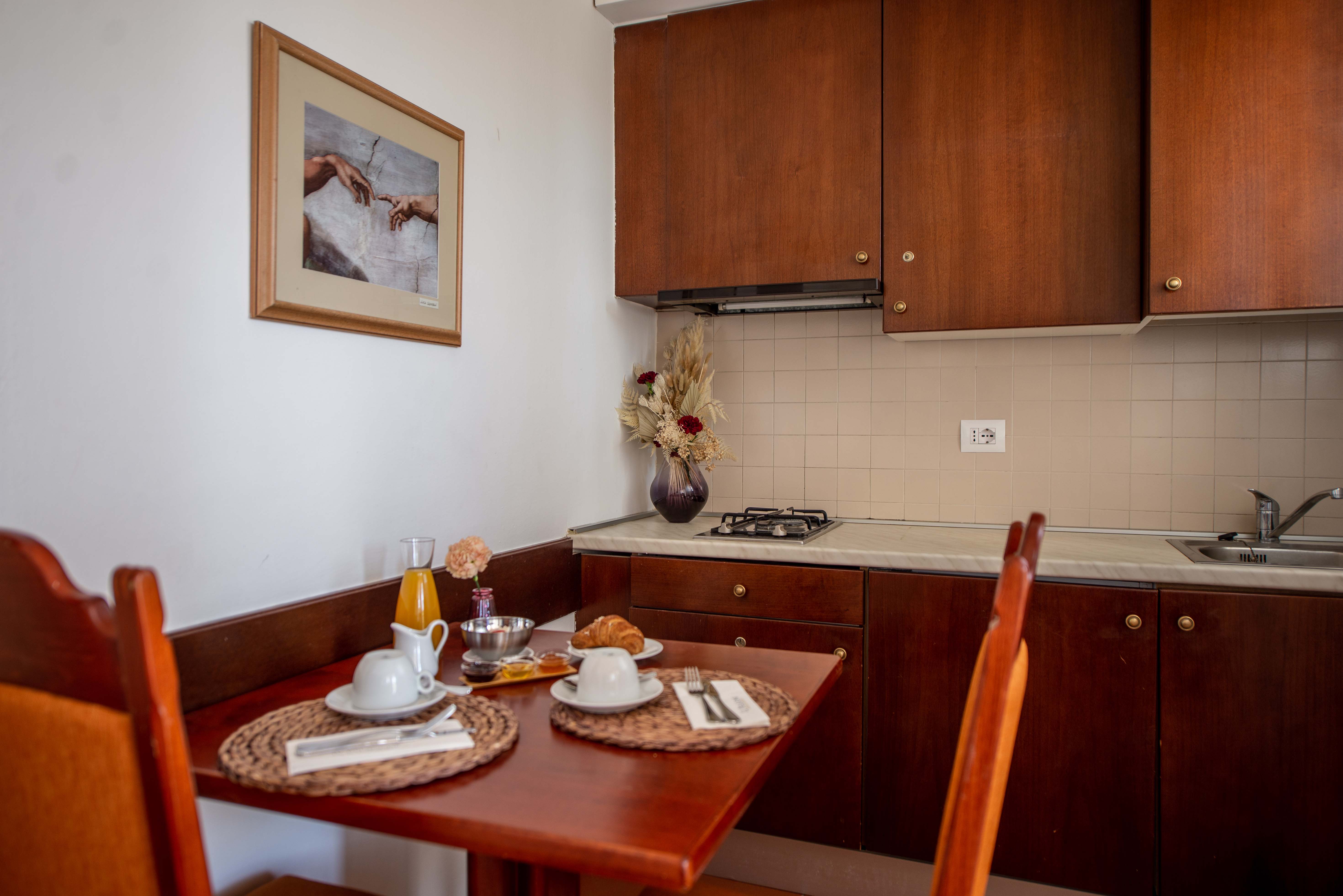 small bathroom, balcony, air conditioning, small refrigerator, telephone, satellite channels, flat-screen TV, heating, and hairdryer. The apartment has a kitchenette with induction hobs for preparing lunch or dinner or enjoying takeaway service from our restaurant.